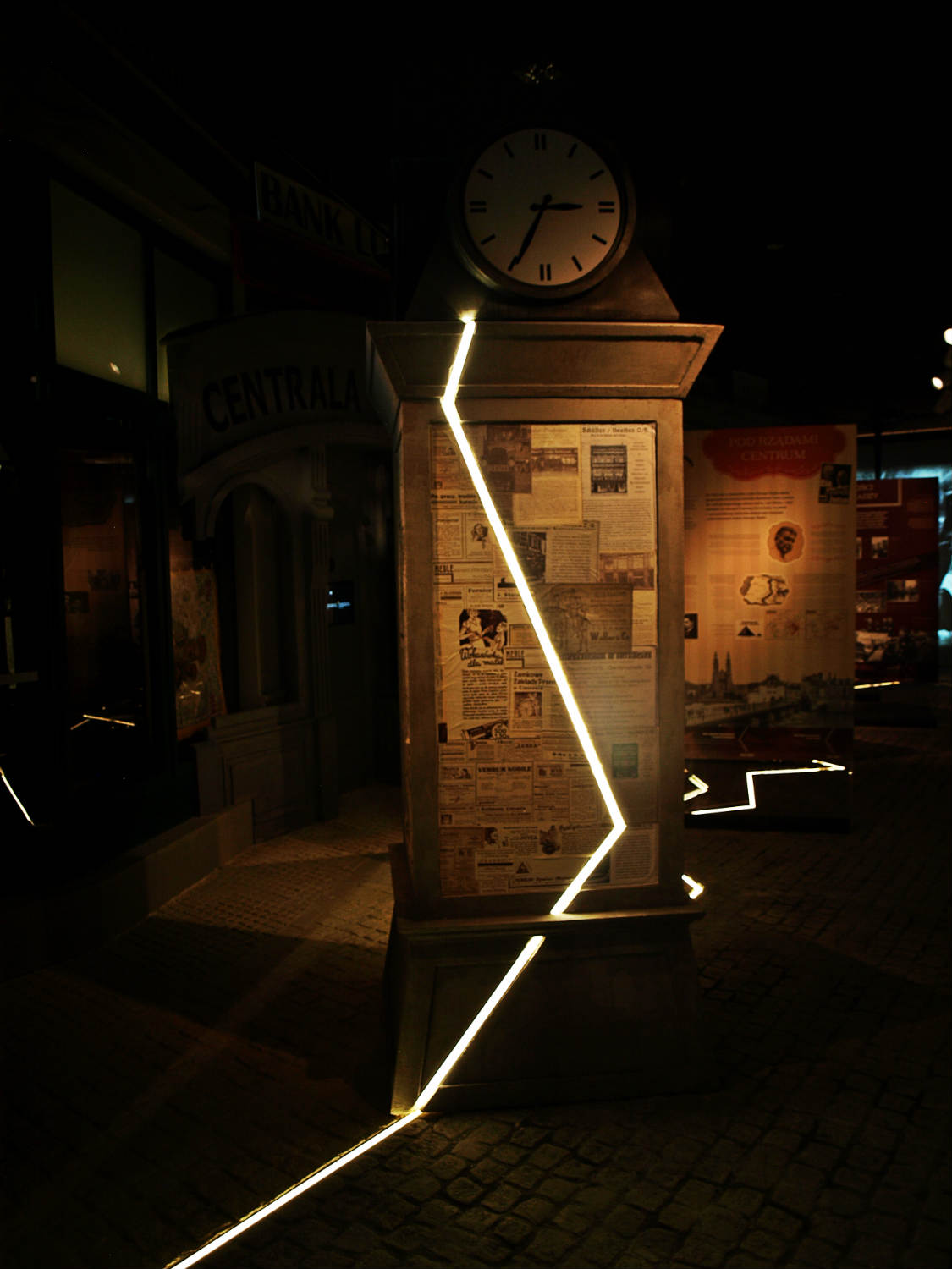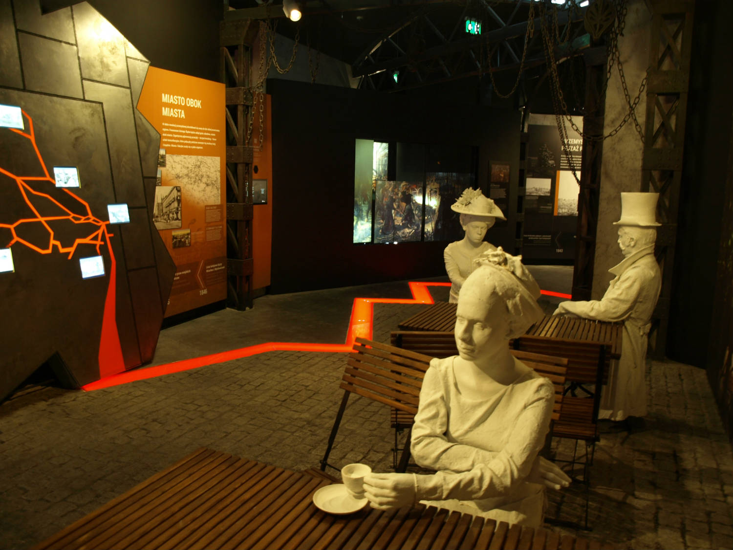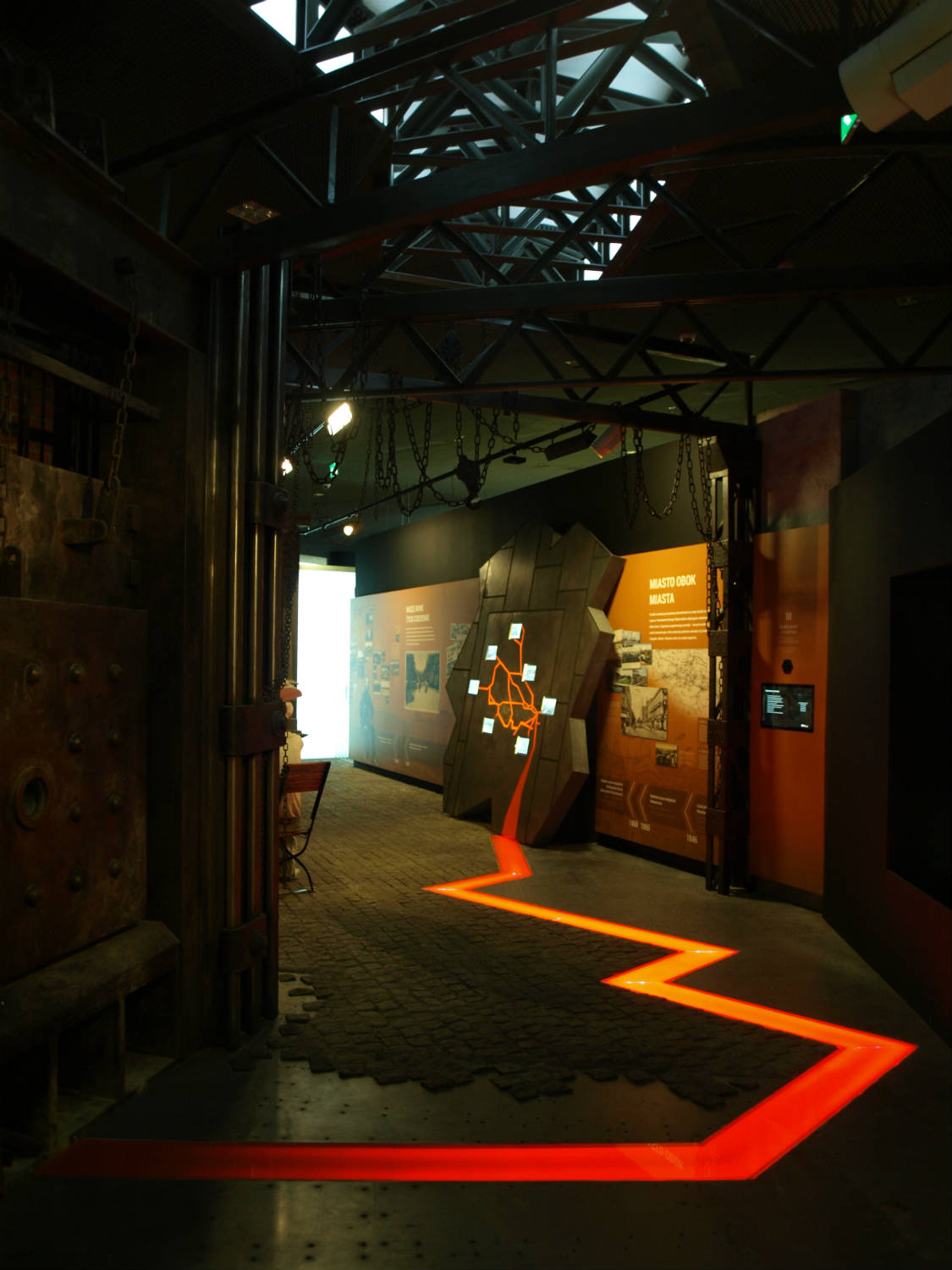 Zaimponowało mi nieustanne podkreślanie przemysłowej historii miejsca, w którym znajdowałem się. Wejście na ekspozycję to odwzorowanie bramy dawnej kopalni Katowice, natomiast tuż za nią znajduje się łaźnia, taka sama, w jakiej do dzisiaj w innych zakładach górnicy wieszają swój arbaj na hoku przed pójściem na szychtę. Największe wrażenie w całej wystawie zrobiło na mnie połączenie huty z kawiarnią, w której arystokracja piła kawę. Niezmiernie uderzające było usłyszeć z jednej strony dźwięk kutej stali, a z drugiej gwar i hałas ulicznych kawiarenek. Dźwięk, nie tylko tutaj, ale i na całej wystawie pełni rolę mocnego środka wyrazu. Brawo.