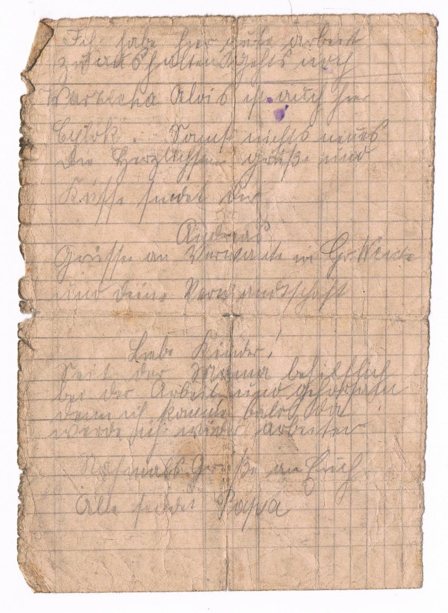 Pozdrawiam cię najserdeczniej. Ciekaw jestem, czy jesteś zdrowa, czy w ogóle jeszcze żyjesz? Nie łam sobie z mojego powodu głowy, bo jestem zdrowy i wnet wrócę do domu. [… – nieczytelny fragment] moja kochana Otti? Czy Alois żyje? [… – nieczytelny fragment] Anna i Gela? Łamię sobie nad tym głowę, z czego żyliście? Rafael Utzka Brzezek Buroschek są + Niedługo potrwa, a przyjedziemy i my, z Langoschem i Stanikiem Utzką do domu. Co robi Starzik (ojciec). Więcej jeszcze chciałbym ci napisać, ale nie wolno mi.