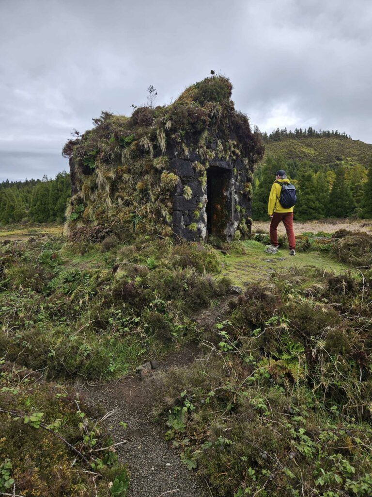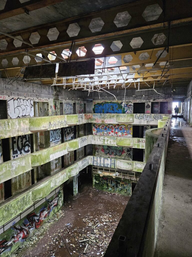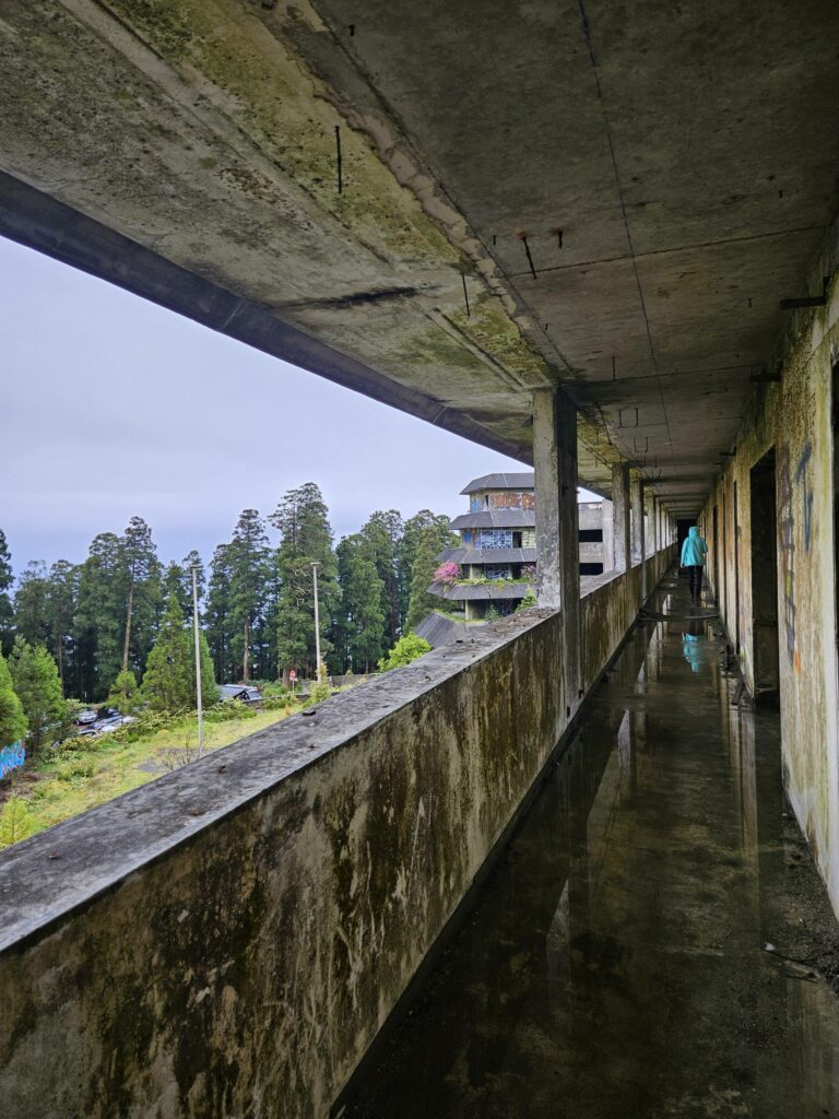 Zaledwie kilka kilometrów dalej znajduje się opuszczony hotel Monte Palace, położony tuż przy punkcie widokowym Vista do Rei. Hotel powstał pod koniec lat 80. jako luksusowy obiekt z widokiem na Sete Cidades, jednak działał bardzo krótko i dziś jest jedną z najbardziej charakterystycznych ruin na wyspie. Ogromny budynek, stopniowo pochłaniany przez roślinność, wygląda jak relikt innej epoki. W środku panuje cisza, wilgoć i lekko melancholijna atmosfera. Choć oficjalnie wejście do wnętrza jest zabronione ze względów bezpieczeństwa, wiele osób decyduje się zajrzeć do środka. My również weszliśmy, ostrożnie, omijając kałuże i zniszczone fragmenty podłóg. Udało nam się dotrzeć na dach, skąd przy dobrej pogodzie rozciągałby się imponujący widok na jeziora i zielone wzgórza. Tym razem musieliśmy uruchomić wyobraźnię, ale i tak było warto. Przy takiej pogodzie kalosze okazałyby się idealnym wyborem.