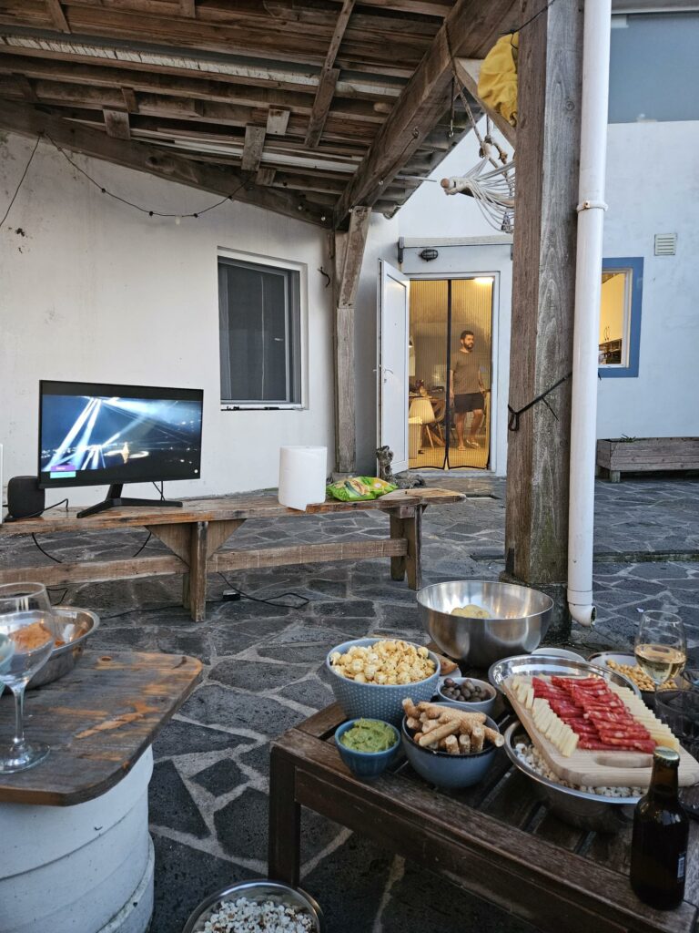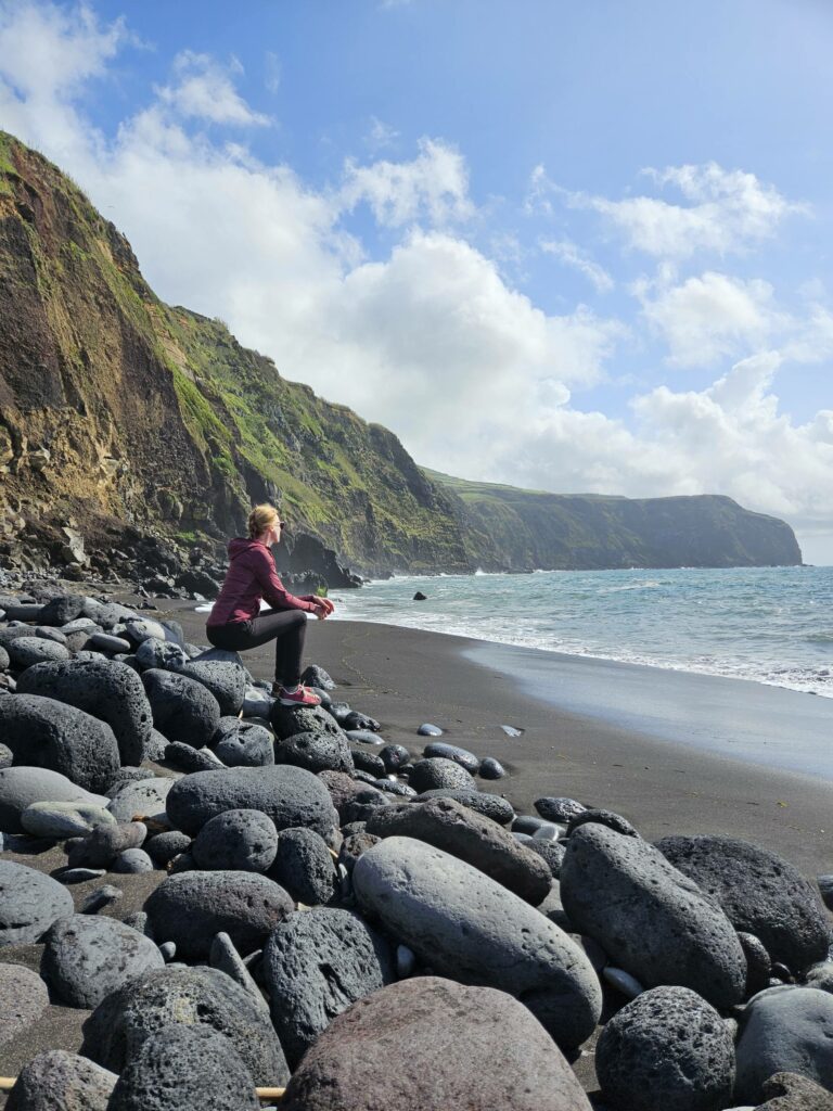 Dzień zakończyliśmy na Praia dos Mosteiros, jednej z najbardziej charakterystycznych plaż na wyspie, położonej na jej zachodnim krańcu. Plaża ma czarny, wulkaniczny piasek i otoczona jest klifami oraz skalnymi wysepkami wystającymi z oceanu. Przy spokojnych warunkach morskich można tu korzystać z naturalnych basenów skalnych, jednak tego dnia ocean był zbyt wzburzony. Mimo to miejsce idealnie nadaje się na krótki spacer i zakończenie dnia przy oceanie.