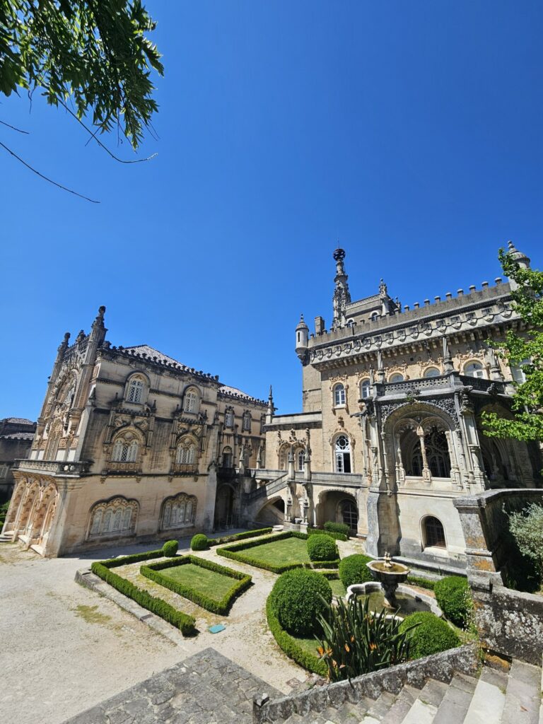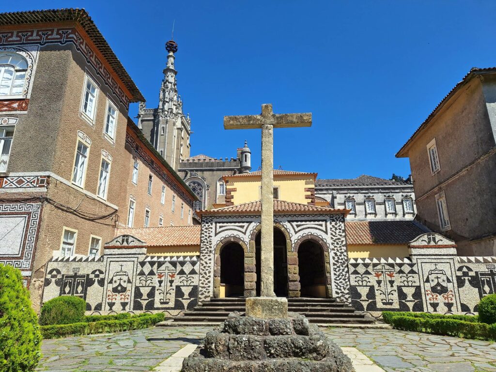W samym sercu kompleksu znajduje się dawny klasztor, który pod koniec XIX wieku został przekształcony w imponujący pałacowy hotel, Palace Hotel do Bussaco. Budynek zachwyca bogato zdobioną fasadą w stylu neomanuelińskim, detalami inspirowanymi portugalskimi odkryciami geograficznymi oraz pięknymi azulejos przedstawiającymi sceny historyczne. W dawnym pałacu można dziś nocować. Jest to w pełni funkcjonujący hotel, który pozwala spędzić noc w naprawdę wyjątkowym otoczeniu. Na miejscu działa również elegancka restauracja, jednak jest ona dostępna wyłącznie dla gości hotelowych. Nawet jeśli nie planuje się noclegu, warto podejść pod sam budynek i obejść go dookoła.